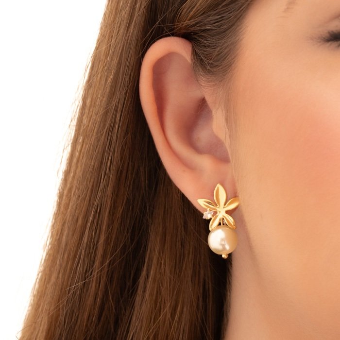 BRINCO BASE FLOR COM DETALHE ZIRCONIA NAVETE E PEROLA 10 MM ESTAMPQTDE PCT: 5 PRS
