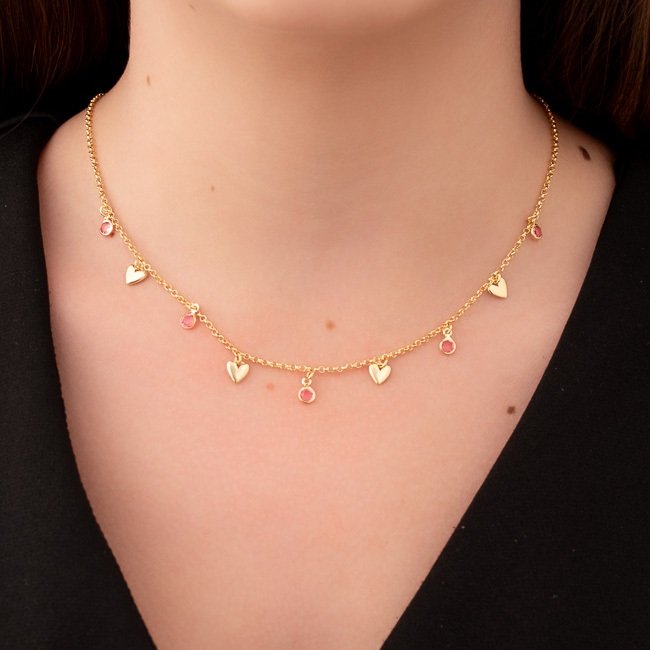 CHOKER ELO PORTUGUES 35 CM 4 CORACAO PUXADINHO BX + 4 PONTO LUZ VIDRO ROSA + 10 CM EXTQTDE PCT: 5 PÇS