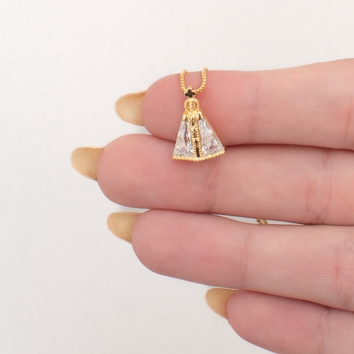 PINGENTE NOSSA SENHORA APARECIDA 1,5 CM CRAVEJADO COM ZIRCONIA EM FORMATO DE TRIÂNGULOQTDE PCT: 5 PÇS