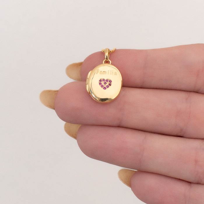 PINGENTE RELICARIO COM CORAÇÃO CRAVEJADO EM ZIRCÔNIA E ESCRITO FAMÍLIA 1,5 CMQTDE PCT: 5 PÇS