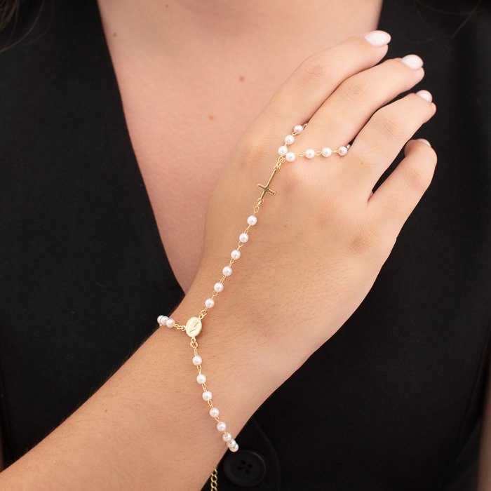 PULSEIRA DE MAO (HAND CHAIN) PEROLA CRUZ NS GRACAS + 7 CM EXTQTDE PCT: 5 PCS