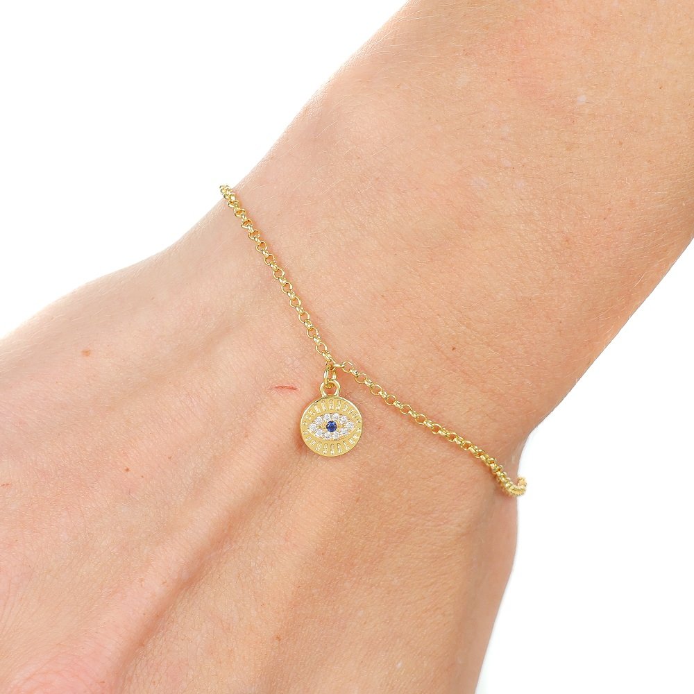 PULSEIRA ELO PORTUGUES 3 MM MOEDA OLHO GREGO 9 MM ZIRCONIAS CRISTAL MEIO AZUL IMP + 7 CM EXTQTDE PCT: 5 PÇS
